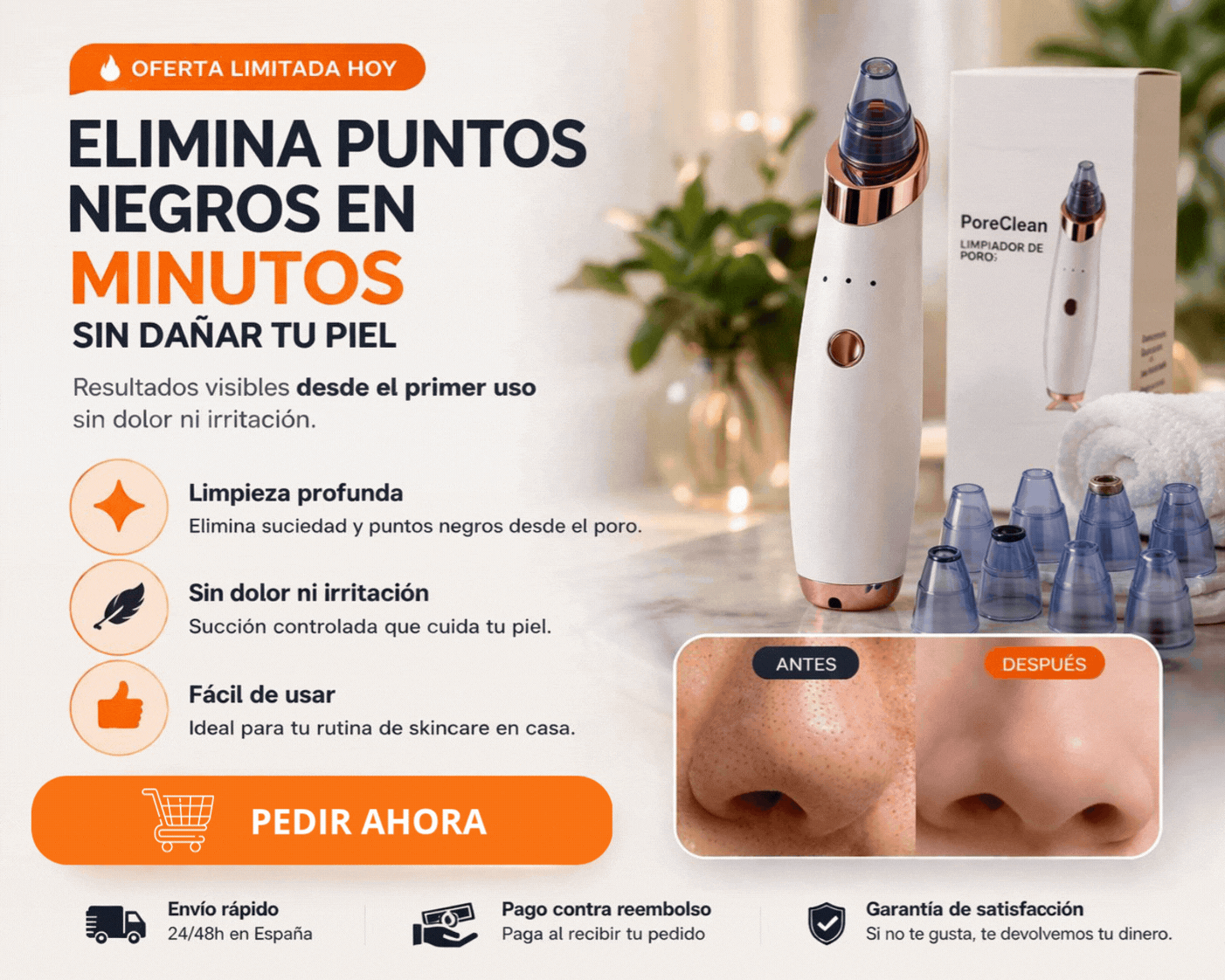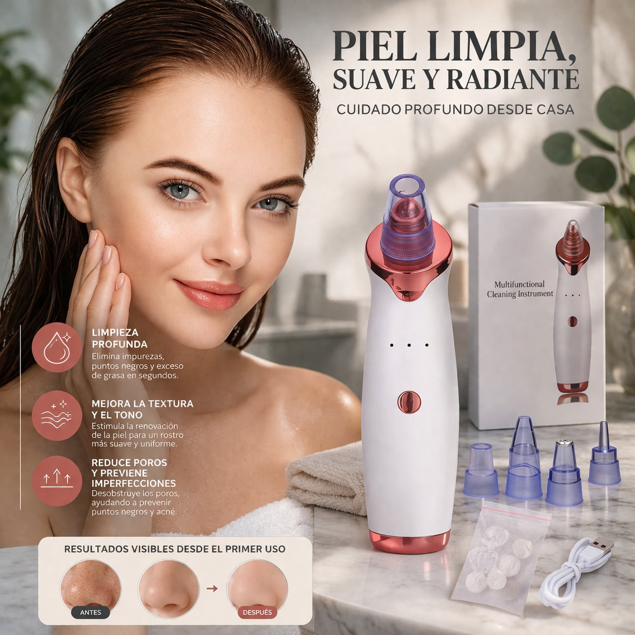 PoreClean Pro utiliza tecnología de succión controlada para eliminar puntos negros, grasa e impurezas directamente desde el poro, sin dañar la piel y sin necesidad de apretar.